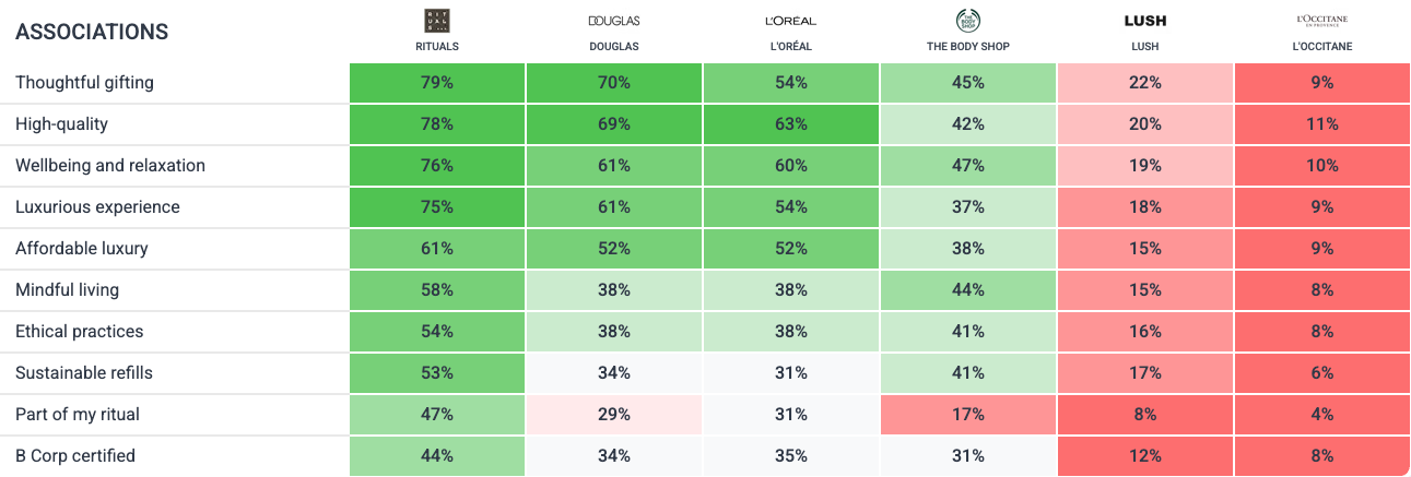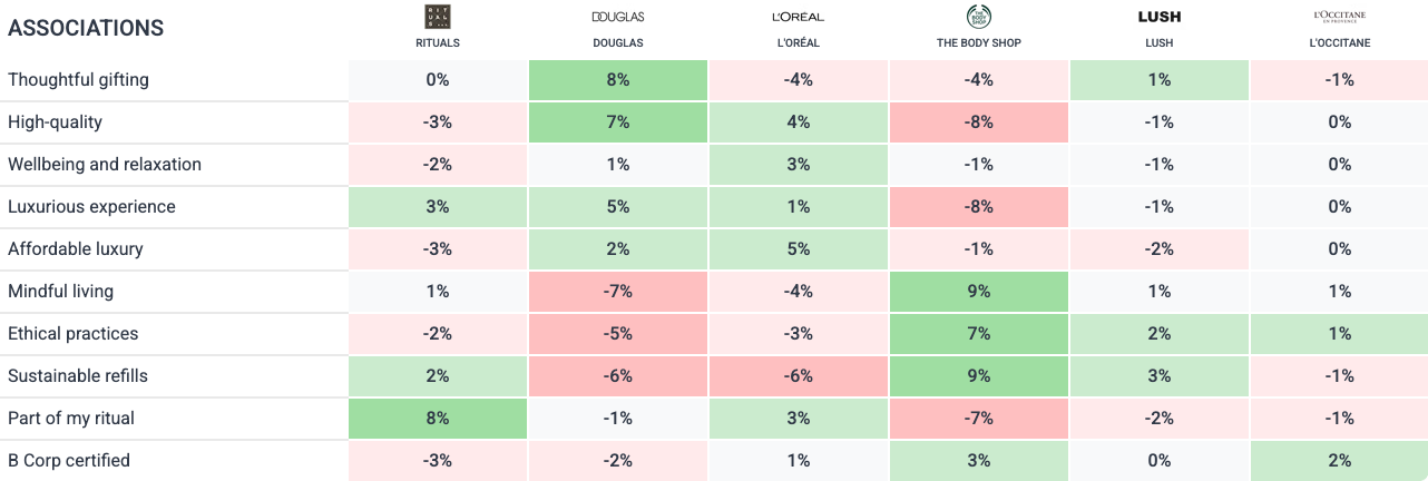 While Rituals tops the absolute rankings on sustainability, that's largely a function of its overall brand size. When you adjust for brand awareness, The Body Shop comes out on top: +9% on sustainable refills and +7% on ethical practices. Consumers connect this brand with sustainability far more strongly than its market position alone would predict.